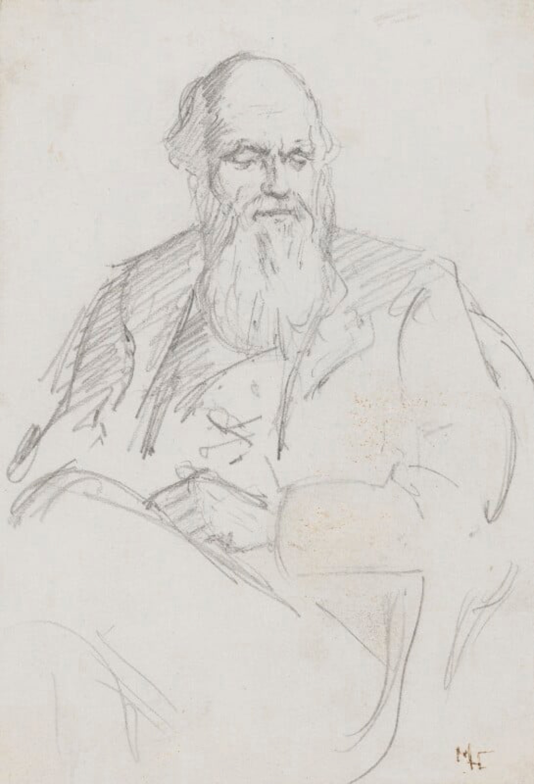 Portrayals of Darwin by women in his social circle cannot be lumped together as the products of adoring amateurs. In 1878 he was sketched by Marian ('Mady') Huxley, who was then only in her late teens, but already a trained and accomplished artist. This is her only recorded portrait of Darwin: a quick and not unflattering pencil sketch, which shows him turning in his chair in a relaxed way, as though to look at some object of interest.