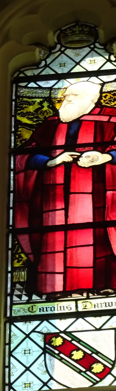 The window features pairs of full-length figures, the benefactors and luminaries of the College through the centuries, but the arrangement is seemingly not ordered by historical period or vocation. Darwin, at top right, is the only man whose achievements belonged to recent history, and he is shown wearing the academic robes of a Doctor of Laws, in reference to the honorary degree conferred on him by Cambridge University in 1877. He is paired here with William Paley, whose rooms at Christ's College he had inherited, and whose Evidences of Christianity had been required reading when Darwin was an undergraduate. However, the pairing of the two men also brings into focus the contrast between the natural theology which Darwin inherited from Paley and the evolutionary theories through which he ultimately discredited Paley's view of the creation. He points to an object held in his left hand - apparently an ape's skull, the contour of which mischievously echoes that of his own head.
