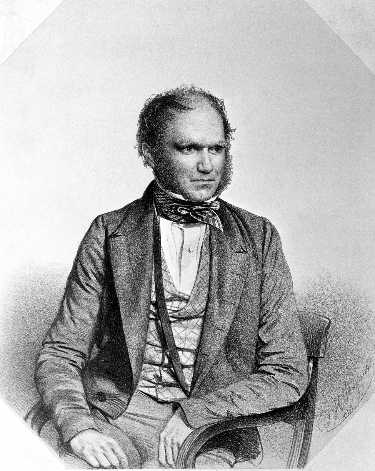 As so often, the portrait of Darwin differs significantly from those of his scientific peers. Where Hooker and Lyell are at ease, elegant and impressive, Darwin, though half-smiling, appears agitated by his own intense thoughts, self-conscious and awkward in his pose. Darwin told Henslow, 'My wife says she never saw me with the smile, as engraved', but that otherwise she considered the portrait 'very like'. His stress and excitement in these years, when the theory of natural selection was taking shape in his mind, would become even more evident a few years later in the drawings by Samuel Lawrence and in photographs taken by the firm of Maull and Polyblank.
