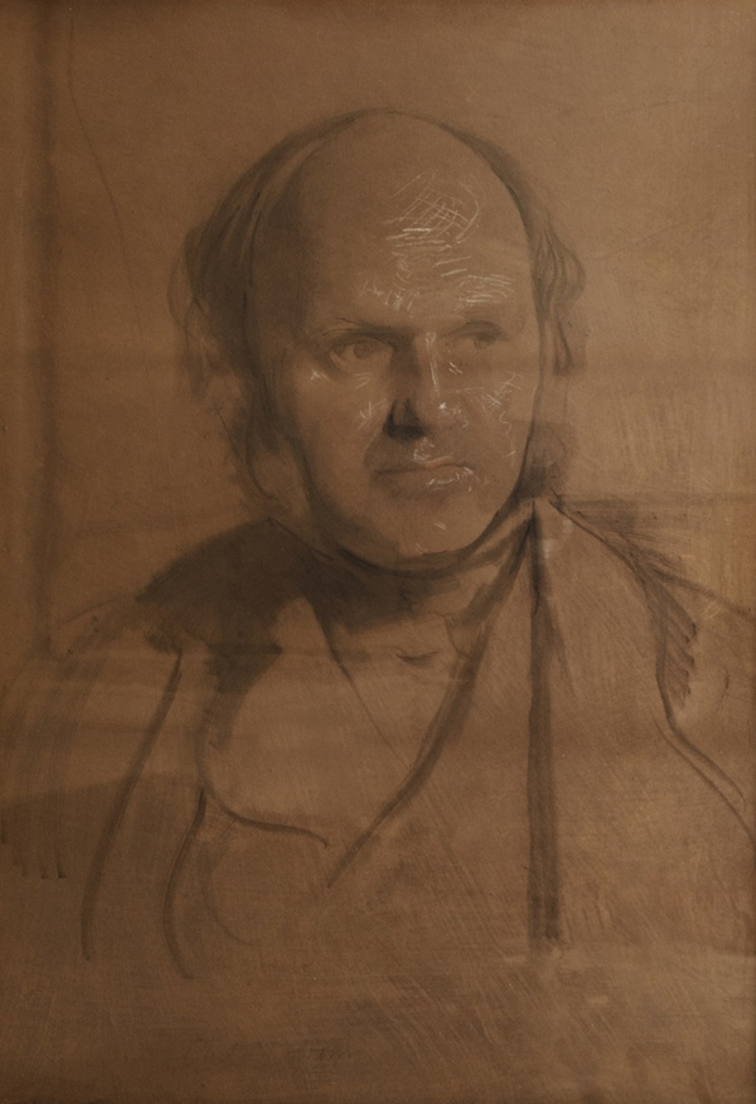 This chalk sketch of Darwin by Samuel Laurence is (as Francis Darwin surmised) likely to have been done in 1853, at the same sitting as the portrait in three-quarter view which is now at Down House. It is inscribed on the back of the sheet: 'Sketch of Charles Darwin made by Samuel Laurence with a view to the large portrait in oil at Down. This was bought by me from Munns [i.e. Messrs F. Munns in Cambridge] after the sale of the contents of Samuel Laurence's studio. T. McKenney Hughes.' Frank Miles, in his typescript catalogue of Laurence's works, noted that the catalogue of the Laurence studio sale by the London firm of Puttick and Simpson in 1884 'makes no mention of a Darwin portrait'. However, the lots included 'Various large original Sketches of Portraits (un-named)': it would not be surprising if the young beardless Darwin in this slight sketch was unrecognised. The reference to an oil portrait of Darwin by Laurence is again unexplained. What is certain is that Thomas McKenny Hughes, Woodwardian Professor of Geology at Cambridge, lent this drawing to the Darwin Centenary exhibition at Christ's College in 1909. He subsequently gave or bequeathed it to the Sedgwick Museum of Geology (now the Sedgwick Museum of Earth Sciences), which he had helped to found, and which opened in its new building in 1904.