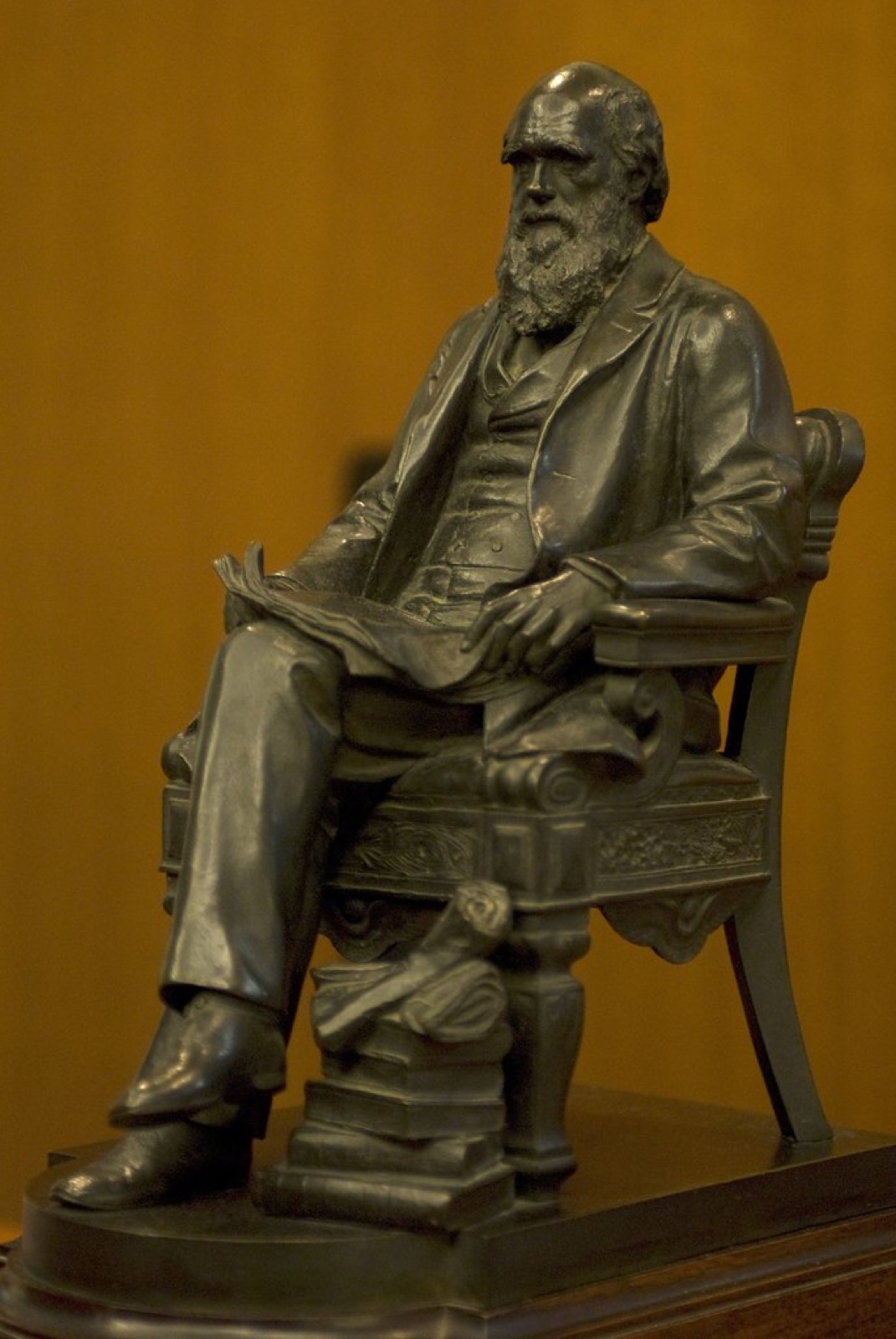 Horace Montford reproduced the design of his seated statue of Darwin at Shrewsbury (1897) as a small bronze statuette. He lent the 'original cast' of the statuette to the Darwin Centenary exhibition at Christ's College, Cambridge, in the summer of 1909, and according to Freeman's Darwin Companion, copies were also on sale in that year. One was acquired in unknown circumstances by the American Darwin enthusiast Charles Finney Cox. It was not among Cox's loans to the Darwin exhibition in the American Museum of Natural History, New York, in spring 1909, so he may have acquired it subsequently, probably direct from the sculptor. After Cox's death in 1912, the statuette passed with the rest of his collection of Darwiniana to the New York Botanical Garden, and it is on display in the Rare Books Room of the LuEsther T. Mertz Library there. It is signed on the back, 'H. Montford'.