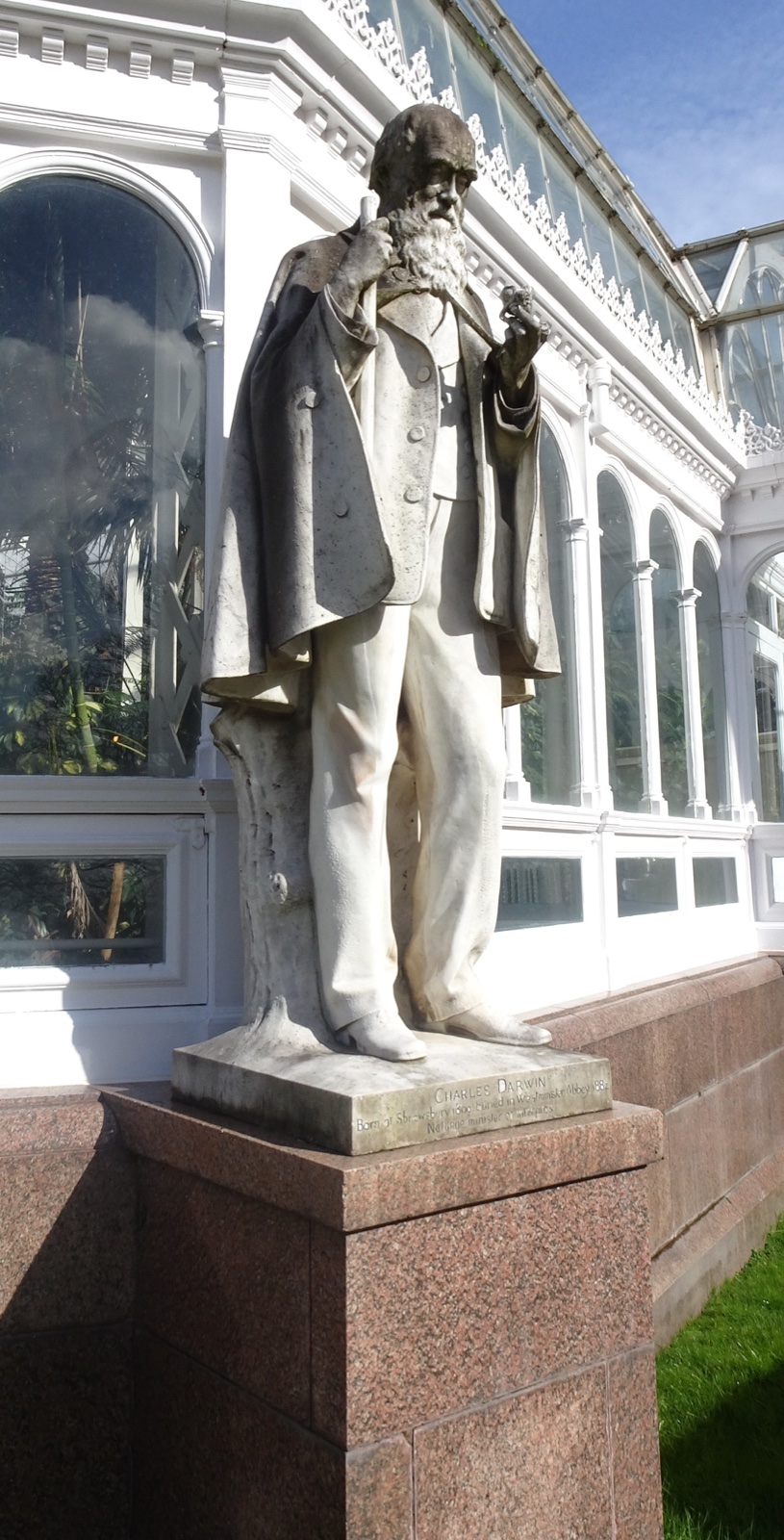 This is a fine three-tiered glass and iron octagonal structure on a polished granite base, with four decorated entrance porches at points of the compass. There are eight life-size statues on granite plinths at the angles of the octagon (c.1896-1897), flanking the entrances. All were the work of the French sculptor Léon-Joseph Chavalliaud, who was resident in Britain in the 1890s, and received commissions for busts, statues and tomb monuments. When Thompson was presented with the freedom of Liverpool in 1901, he commented on the fact that most public statues were of royalty, generals, admirals or local worthies; but he had wished to create in Sefton Park 'a sort of Valhalla' of 'men who were at the head of their profession in various ways, not only in Liverpool or in England, but all the world over'. The effigies of these great men of all centuries would instruct and inspire visitors to Sefton Park, 'especially the younger people'. They fell into two alternated groups, distinguished both by the nature of their claims to greatness and by the material which Chavalliaud used for the statues. Four of them (Darwin, John Parkinson, Linnaeus and Le Nôtre) were pioneering 'gardeners', sculpted in marble; and the other four (Columbus, 'Henry the Navigator', Captain James Cook and Mercator) were seafaring explorers and cartographers, sculpted in bronze. Thus Thompson intended to allude both to the garden and park setting of the Palm House, and to the history of Liverpool as a major port for voyagers to the Americas. In this rather idiosyncratically chosen 'Valhalla', Darwin was the only man who had lived and worked in recent times, as was also the case in the series of statues of great scientists in the Oxford University Museum. It is a reminder that, while Darwin's unique image was carefully controlled by his family during his lifetime, posthumous portrayals co-opted him to many divergent schemes and purposes. Here Darwin, wearing his familiar outdoor cape and carrying a stick (now partly broken off), is closely inspecting a flower, perhaps an orchid: the emphasis is on first-hand analysis of natural phenomena rather than on abstract thought. Thus the inscription on the plinth reads 'CHARLES DARWIN Born at Shrewsbury 1809 buried in Westminster Abbey 1882/ Naturae minister et interpres' - the scientist as servant and interpreter of nature, a quotation from Francis Bacon.