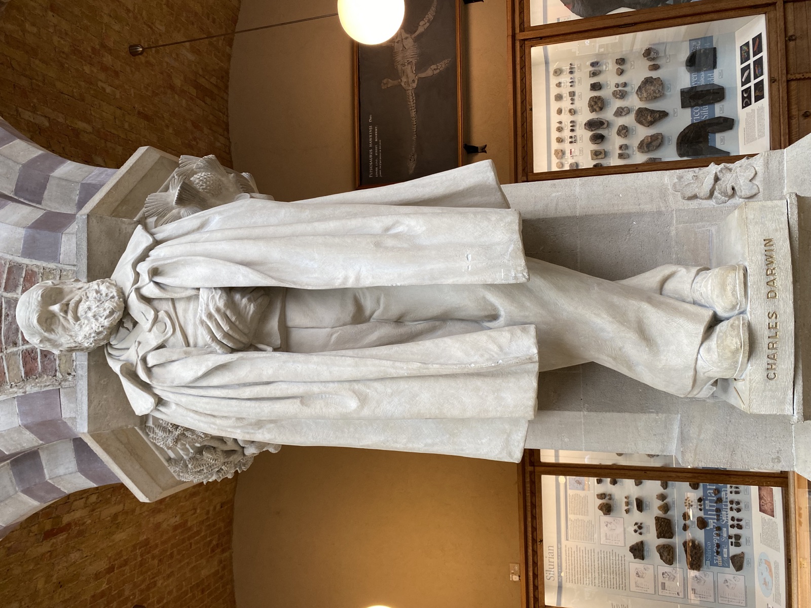 The portrait of Darwin may have seemed like a startling intrusion into the cathedral-like interior of the museum, where the hallowed sages of past times, such as Euclid, Aristotle, Galileo, Linnaeus and Harvey, were shown like so many saints, lost in profound thought, and offering 'contemplation and example' to the onlooker. However, as the Vice-Chancellor of the University, Thomas Fowler, noted at the unveiling of Darwin's statue, the intellectual breadth of his researches - his integration of scientific specialisms into a holistic study of the natural world and of human cultural development - was, in one sense, ideally attuned to the original vision of the building and its functions that Acland and John Ruskin had conceived half a century earlier. In bringing together under one roof the scientific departments and specimen collections previously scattered across Oxford, Acland and Ruskin had intended to demonstrate the interdependence of all scientific fields, and to introduce students, including those studying the humanities, to the fundamental principles of the sciences. They believed that investigations of the workings of God's unitary creation could lead not, as many in Oxford then feared, to atheism, but rather to wisdom and reverence. As the century progressed, the natural theology which underpinned this ideal was increasingly overtaken by more racist and imperialist notions. The series of skulls later exhibited in the central court of the museum to represent supposed racial characters, and the graded artefacts of 'primitive' peoples in the Pitt-Rivers collection were all intended to exemplify the potential for 'progress in design and evolution in human culture'. This 'progress' was believed to reach its highest point in modern European (especially British) intellectual achievements, of which Darwin was often cited as the supreme example. Whereas many of the Oxford statues introduced accessory objects indicative of the scientists' particular experiments and researches, Hope Pinker's Darwin has none, and this presentation of him as purely a great thinker is wholly typical of Darwin iconography in general.