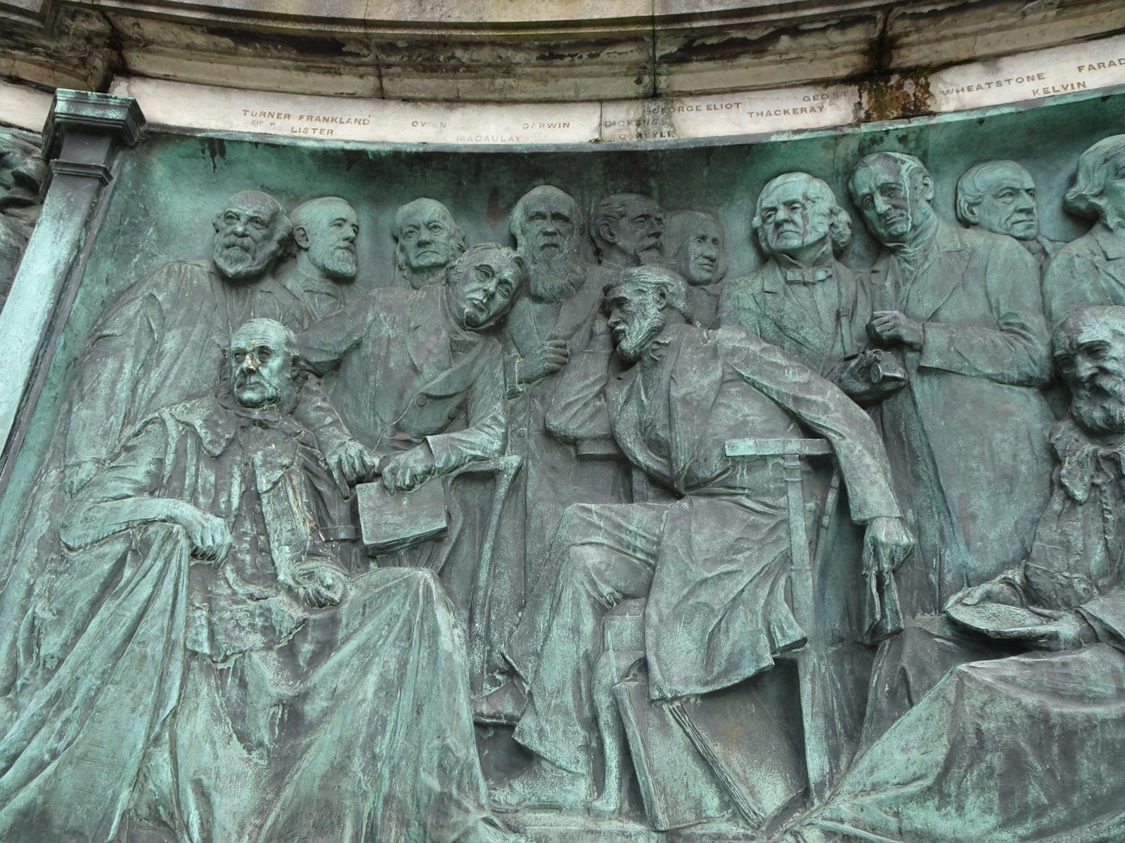 The monument to Queen Victoria in Dalton Square, Lancaster, is one of many late nineteenth- and early twentieth-century public projects that featured Darwin among the great men of history - often, as here, in the context of patriotic celebration of the achievements of Victoria's reign. It was commissioned by James Williamson, 1st Baron Ashton, and created by Herbert Hampton, who specialised in public memorials and portrait sculpture, exhibiting regularly at the International Society of Sculptors, Painters and Gravers in London. Lord Ashton was immensely rich as a manufacturer of oilcloth and linoleum, and he lavished patronage on his native town, which, for nearly a decade (1886-1895), he represented in Parliament. He also paid for the construction of Lancaster Town Hall on Dalton Square, which is contemporary with the Victoria Memorial, and the two structures may be considered as an ensemble - rather like the relation between the Royal Albert Hall and the Albert Memorial in Kensington. The Queen looks towards E.W. Mountford's ornate building, her orb surmounted by a winged victory, and on the back of her pedestal is an inscription: 'Given to his native town by Lord Ashton A.D. 1906'.