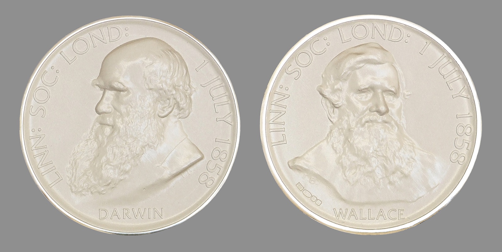 In 1908 the Linnean Society celebrated the jubilee of 'the greatest event' in its whole history, which had occurred on 1 July 1858: the presentation by Charles Lyell and Joseph Hooker of papers by Darwin and Alfred Russel Wallace outlining the theory of evolution by natural selection. It was decided to mark the jubilee by commissioning a 'Darwin-Wallace medal', which was designed and modelled by the successful medallist Frank Bowcher, with a portrayal of Darwin on one side and Wallace on the other. According to the minutes of a Linnean Society Council meeting held on 30 January 1908, Edward Poulton, who had commissioned the statue of Darwin in the Oxford University Museum, successfully proposed that 'the Darwin Medal be permanent and awarded at stated periods' to worthy recipients. Foremost among these recipients was Wallace himself, who received his medal (uniquely cast in gold) at a great anniversary meeting on 1 July 1908, widely reported in the press. Wallace mounted the platform 'amid a storm of cheering', and expressed gratitude to the Society, not only for the honour of the award, but also for 'perpetuating his features' together with those of Darwin on the medal. This was, indeed, a pairing of the two men of a kind which had never been sanctioned by Darwin or his family during Darwin's lifetime. Silver medals were then presented to other noted Darwinians from across Europe: Joseph Hooker, Francis Galton, Ray Lankester, Eduard Strasburger, Ernst Haeckel and August Weismann - a member of the German embassy staff received the medals on behalf of the absent Haeckel and Weismann. Hooker in his speech of thanks recalled the momentous reading of the papers in 1858, and the stunned or bemused reactions of the Linnean Society audience; but he also apologised for these 'half-century old, real or fancied memories of a nonagenarian' about 'the most notable event in the Annals of Biology' since the publication of Linnaeus's Systema Naturae. The 1908 ceremony seemed to celebrate but also to mark the close of a key chapter in scientific history: the Manchester Guardian reported that many of the men who attended were, like Wallace and Hooker, 'of very advanced age'.