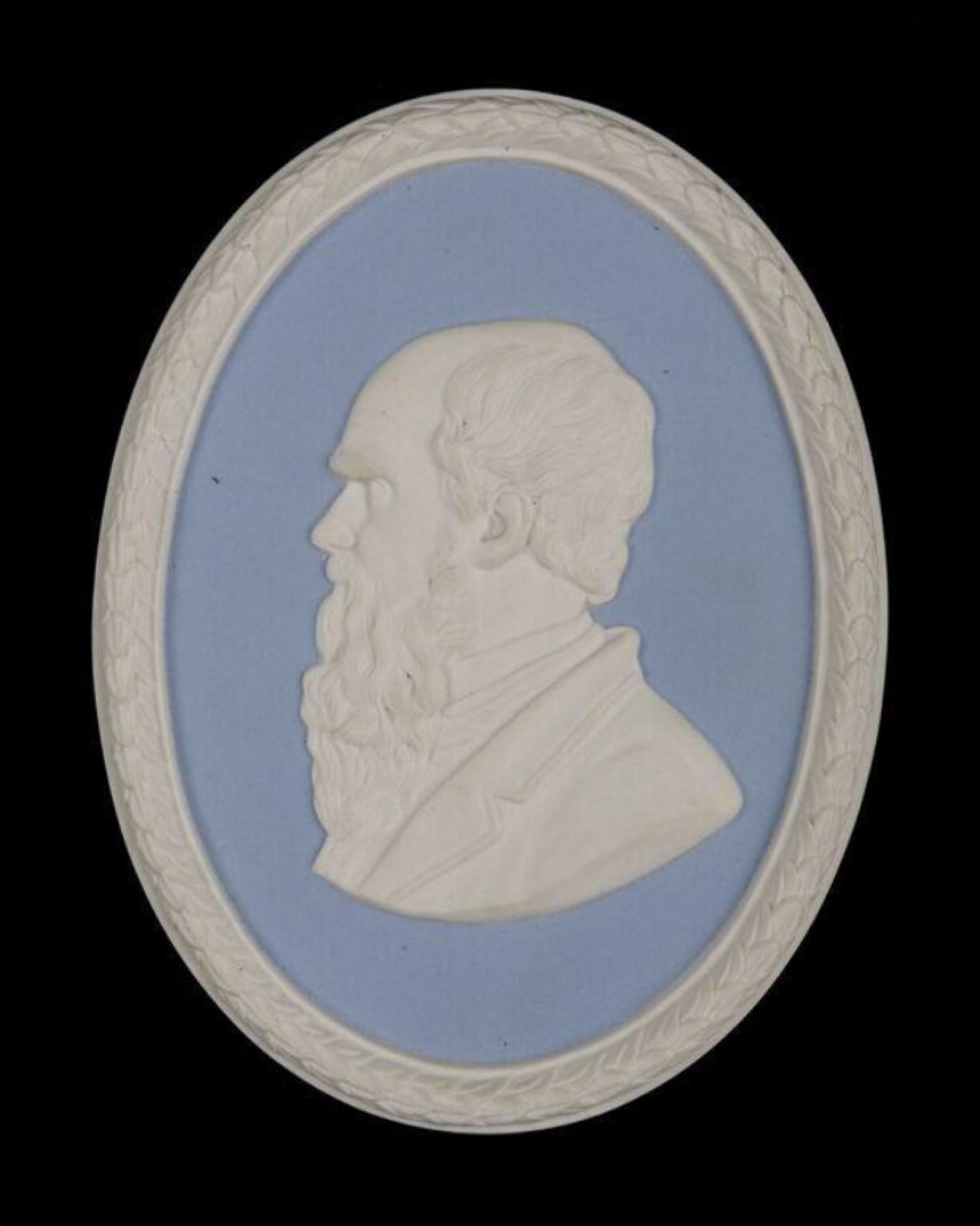 Amy Woolner, in her Life in Letters of her father, dated his model for Wedgwood's Darwin medallion to 1869. Woolner was at Down House in 1868-9, creating a bust of Darwin: the profile portrait in the medallion can thus be seen as a spin-off from the design of the bust, and may even have been based on a side view of it. Three ceramic medallions, all from this one Woolner design, still exist in the collections of the Wedgwood Museum at Barlaston. Two of them are plain ovals in green jasper; the third is in blue jasper with an integral frame like a wreath. Although Darwin wears modern dress, the rather severe neoclassical style of the medallions accords well with the all'antica concept of Woolner's bust of Darwin. At the same time, it harks back to the neoclassicism of Wedgwood's eighteenth-century medallions of famous men, situating Darwin in history as a venerable sage - a worthy successor to philosophers such as John Locke and Adam Smith, who had been portrayed on Wedgwood medallions at an earlier period.