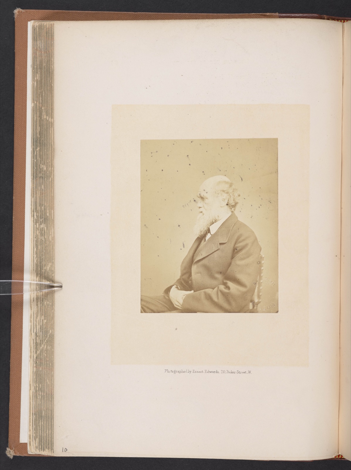 In 1865 Darwin was invited to feature in another series of published photographs, Portraits of Men of Eminence in Literature, Science and Art, with Biographical Memoirs . . . The Photographs from Life by Ernest Edwards, B.A. This enterprise had been launched by Lovell Augustus Reeve in 1863, but by 1865 Edward Walford had taken over as editor, with the writer and photographer Robert Hunt acting as his assistant. The general pattern came from Maull and Polyblank's 'Literary and Scientific Portrait Club' series of the 1850s, but Portraits of Men of Eminence, initially issued in monthly parts, was smaller in page size (octavo) and in the scale of the tipped-in photographs. Darwin wrote to Walford, probably in the spring of 1865, to say, 'I should of course be proud to be one of your Series', as requested, but he could not spare the time to go to Edwards's photographic studio in London just then. In the event, more than one sitting seems to have taken place, in November 1865 and April 1866. Darwin's account book (among Down House MSS) indicates that on 2 March 1866 he made a payment of £1 for 'E. Edwards Photo', but it is not known which photograph this refers to.