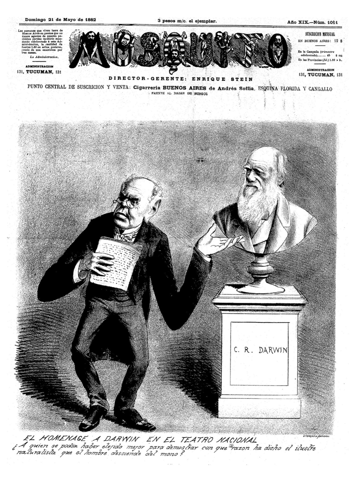 The Buenos Aires satirical journal Mosquito published this cartoon in May 1882, shortly after Darwin's death, with the title 'El Homenage a Darwin en el Teatro Nacional' (The tribute to Darwin in the National Theatre). A politician, perhaps identifiable as Torcuato de Alvear, the newly appointed first mayor of Buenos Aires, is delivering a speech and he gestures admiringly towards a bust of Darwin. Below we read, 'A quien se podia haber elejido mejor para demonstrar con que razon ha dicho el ilustre naturalista que el hombre desciende del mono?' - no one could have been elected mayor who demonstrated more clearly the truth of the famous naturalist's claim, that man descended from the monkey. The figure's unnaturally long arms and bent legs are supposedly simian traits. However, the full meaning of the satire in the context of Argentinian politics has still to be explained.