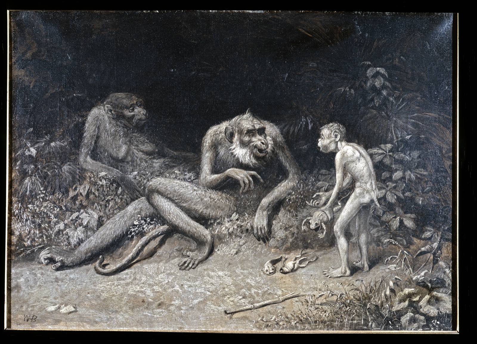 In June 1872, Darwin's friend Asa Gray, the Harvard Professor of Botany, sent him a print or photograph of a comic painting by the American artist William Holbrook Beard. Titled The Youthful Darwin Expounding His Theories, it shows a family of monkeys, seemingly in process of evolution into humans. The 'Darwin' boy-monkey, who is more anthropomorphic than his parents, excitedly shows them an assortment of animal specimens that he has collected, notably a large amphibian. Laid side by side, these creatures supposedly display an evolutionary progression. His monkey parents respond to this display with agitation or scepticism. Beard specialised in such imaginary scenes, where animals impersonate humans. They often resemble the comic taxidermy of the period, but are spiced with provocative allusions to contemporary science or politics. In the Discovery of Adam of 1891, a group of anthropomorphised monkeys, dressed and equipped to look like scientific pedants, have seemingly been carried back to the primeval world, and scrutinise, with dismay, a primitive reptile which is their own supposed ancestor.