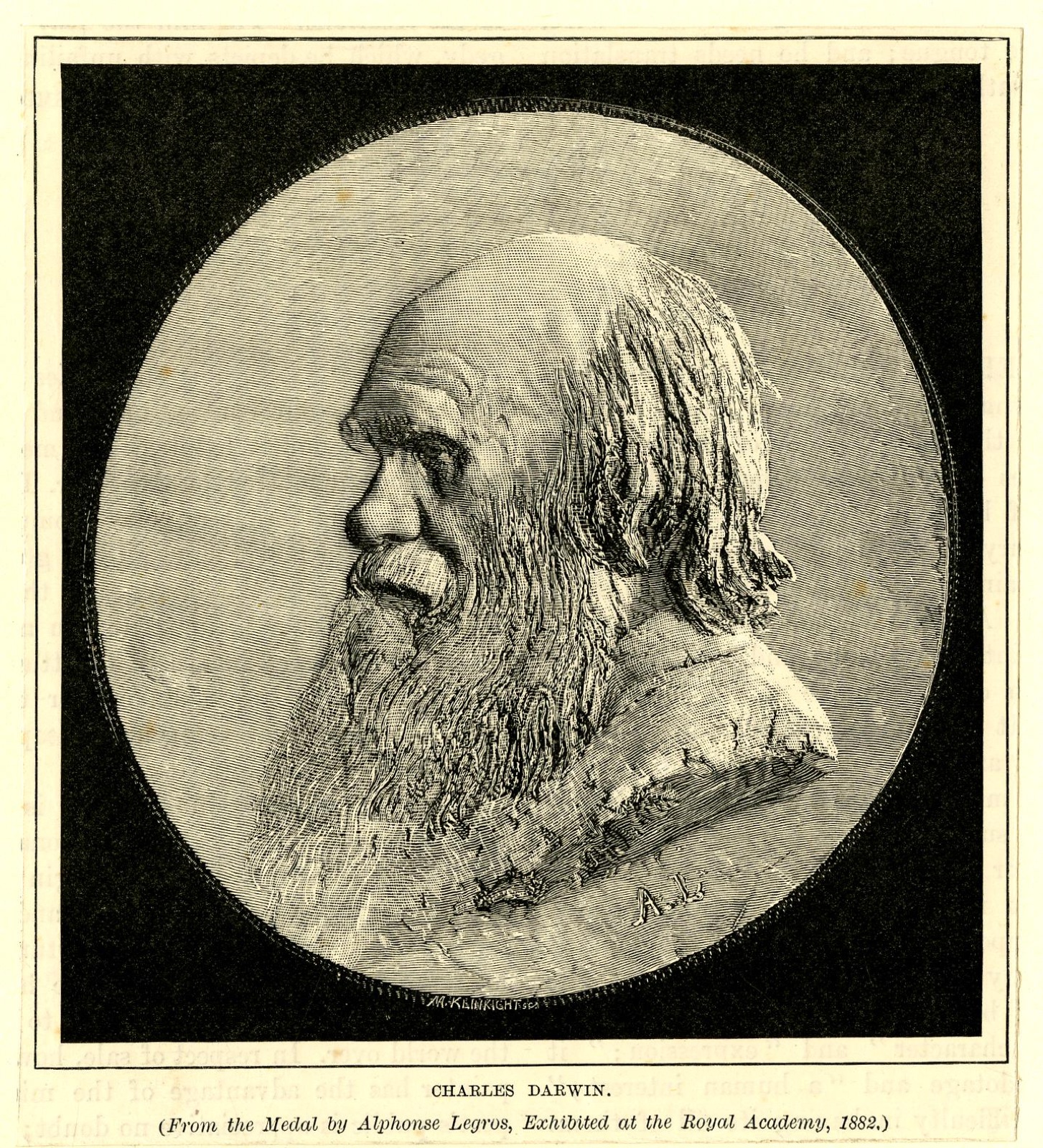 This bold wood engraving is a copy of Legros's bronze portrait medallion of Darwin (see separate entry), interpreting sculptural relief in terms of line and tone. It was executed by the German draughtsman and engraver Moritz Klinkicht, who worked for the Illustrated London News and various London publishers, specialising in portraiture. It exists as an autonomous print, but had originally appeared as an illustration to Cosmo Monkhouse's article on Legros in The Magazine of Art, in 1882, highlighting the sculptor's boldness in fashioning 'the mighty head of Darwin'. According to Monkhouse, the engraver worked from Legros's spontaneously fashioned plaster model, not from the finished bronze. Spielmann also used this print, in preference to a photographic reproduction of Legros's medallion, to illustrate his book British Sculpture and Sculptors of To-day (1901). Neither author credited Klinkicht by name as the engraver. The British Museum's impression of the print is inscribed 'From the medal by Alphonse Legros. Exhibited at the Royal Academy 1882'. Klinkicht had earlier engraved a photograph of Darwin by George Charles Wallich for the Gardener's Chronicle (6 March 1875), p. 309.